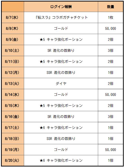 第2弾は8月7日(水)より毎日ログインすることで[『転スラ』コラボガチャチケット]や[SSR 進化の首飾り]などを獲得できます。