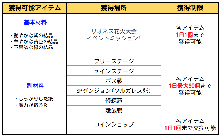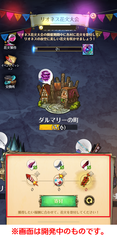 ※イベントアイテム(製作した花火、花火の基本材料、花火の副材料)は「リオネス花火大会」のイベント期間のみご利用いただけるイベントアイテムです。イベント期間内に必ずご利用ください。