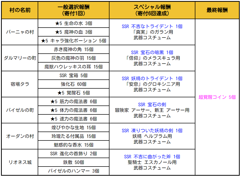 ※表に記載されている一般選択報酬は寄付1回分の報酬であり、3つのうち1つのアイテムを獲得できます。
