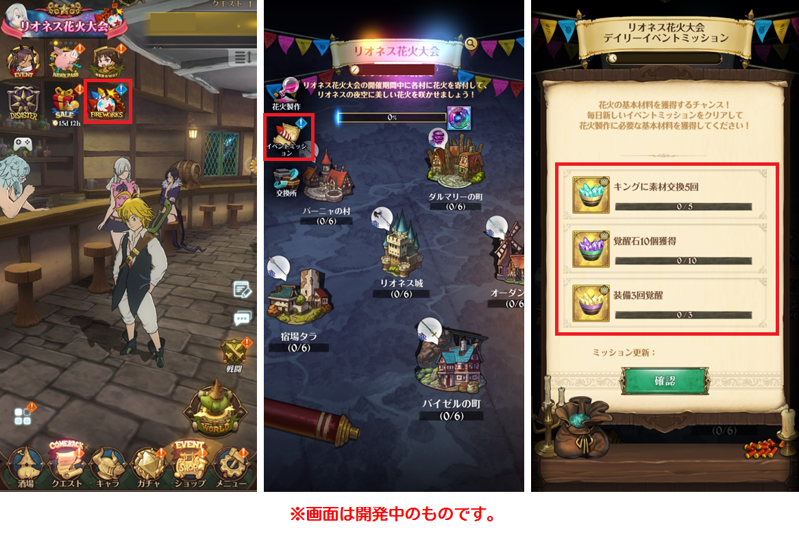 [酒場]画面左上[FIREWORKS]アイコン ≫ [イベントミッション]をタップしてご確認いただけます