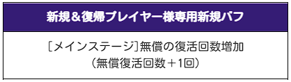 ※新規/復帰プレイヤー専用バフは、スキップおよびホークママの撃退などには適用されません。