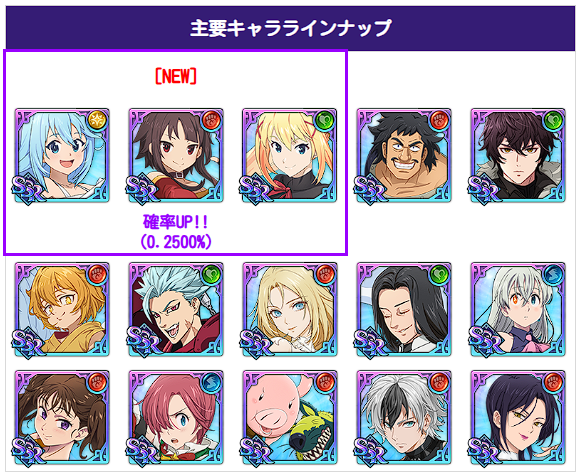 ※新キャラ[【アークプリースト】水の女神 アクア、【アークウィザード】紅魔族の少女 めぐみん、【クルセイダー】女騎士 ダクネス]は当ガチャ期間終了後、常設ガチャのラインナップに追加されません。