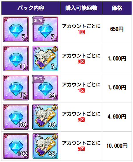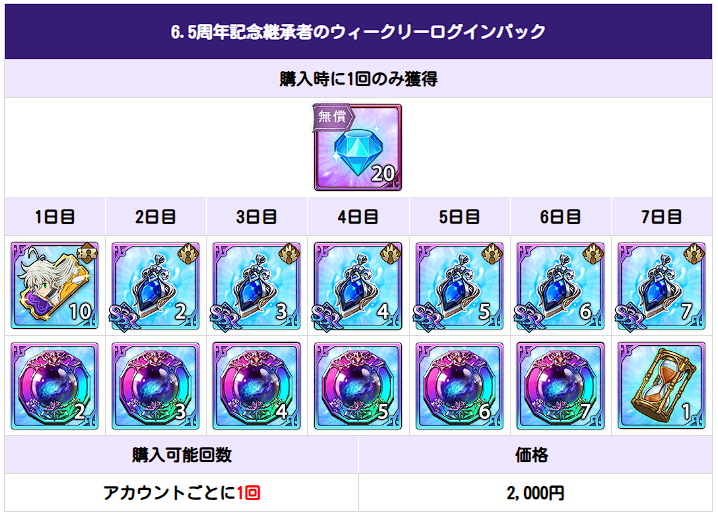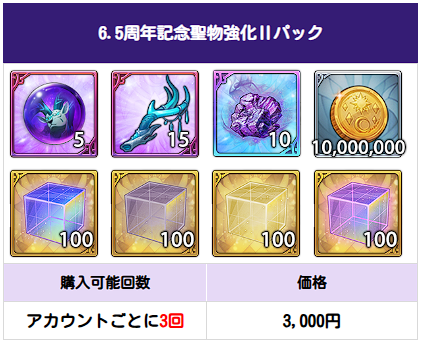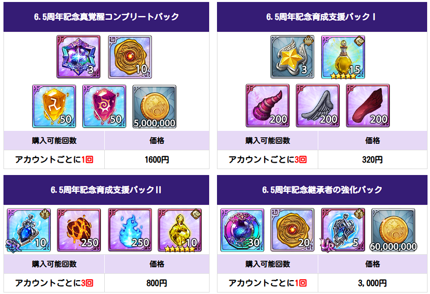 ※[6.5周年記念真覚醒コンプリートパック]、[6.5周年記念継承者の強化パック]は、[【リオネスの光】予言の騎士 トリスタン]の最初獲得時のみ12時間の間表示されます。