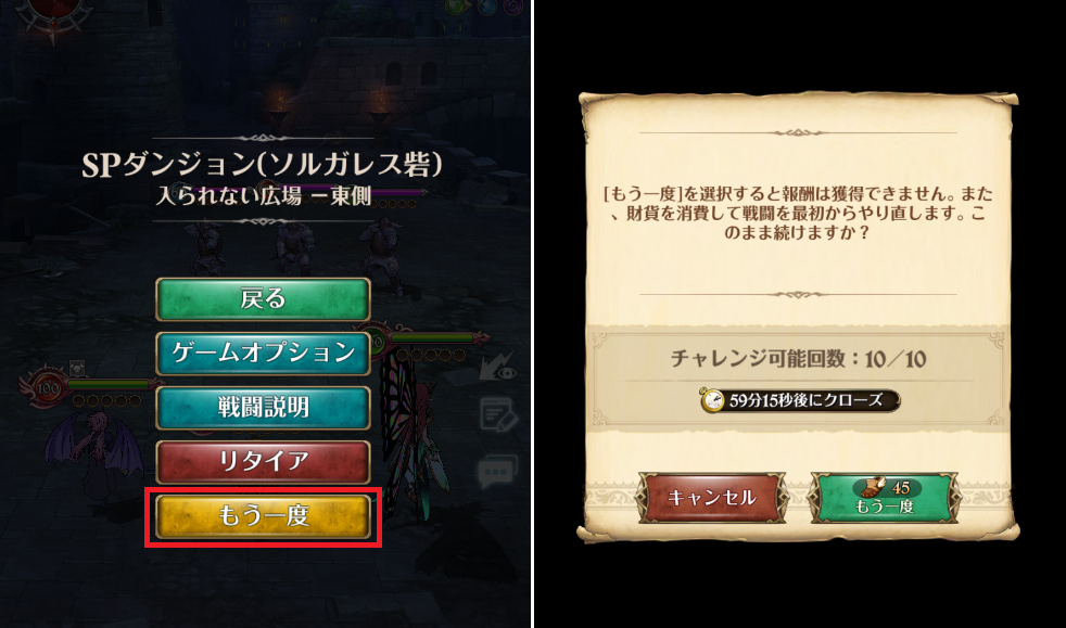 ・[もう一度]を選択すると、現在プレイ中のダンジョンの報酬は獲得することができません。また、APを消費して最初からやり直します。