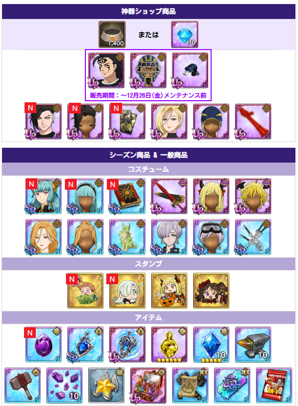 ※神器ショップ商品は、開催期間に関係なく販売中であればダイヤやホークパスマイレージで購入可能です。