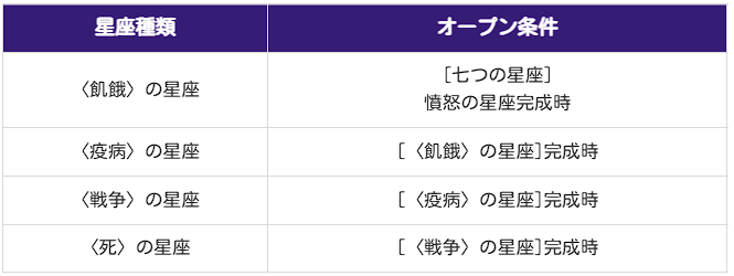 ・[四騎士の星座]の完成によって[七つの星座-暴食、傲慢、憤怒]に星座の混沌が順に解禁されます。