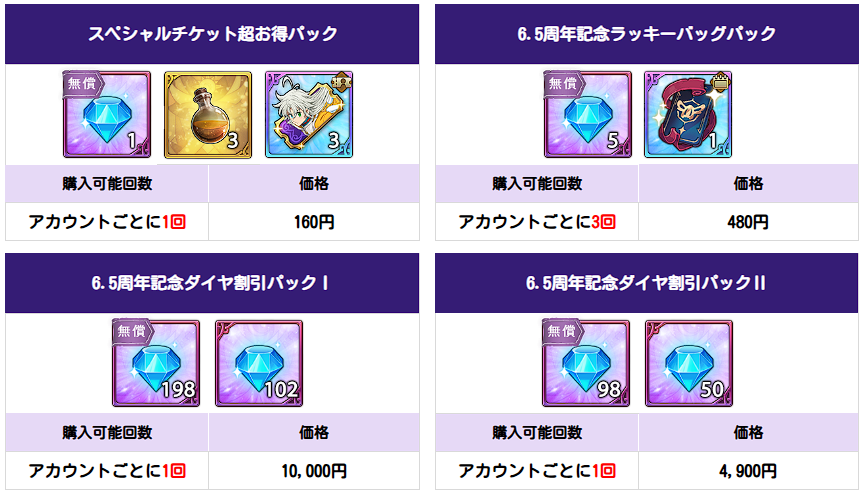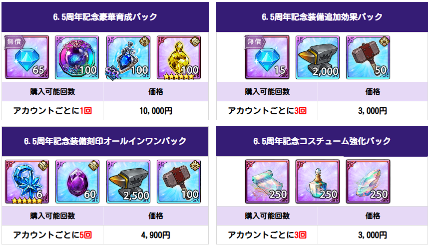 ※[6.5周年記念装備刻印オールインワンパック]、[6.5周年記念コスチューム強化パック]、][6.5周年記念選べるアンケートパワーアップガチャSTEP1~3]は、12月4日(木)メンテナンス後に購入可能回数がリセットされます。