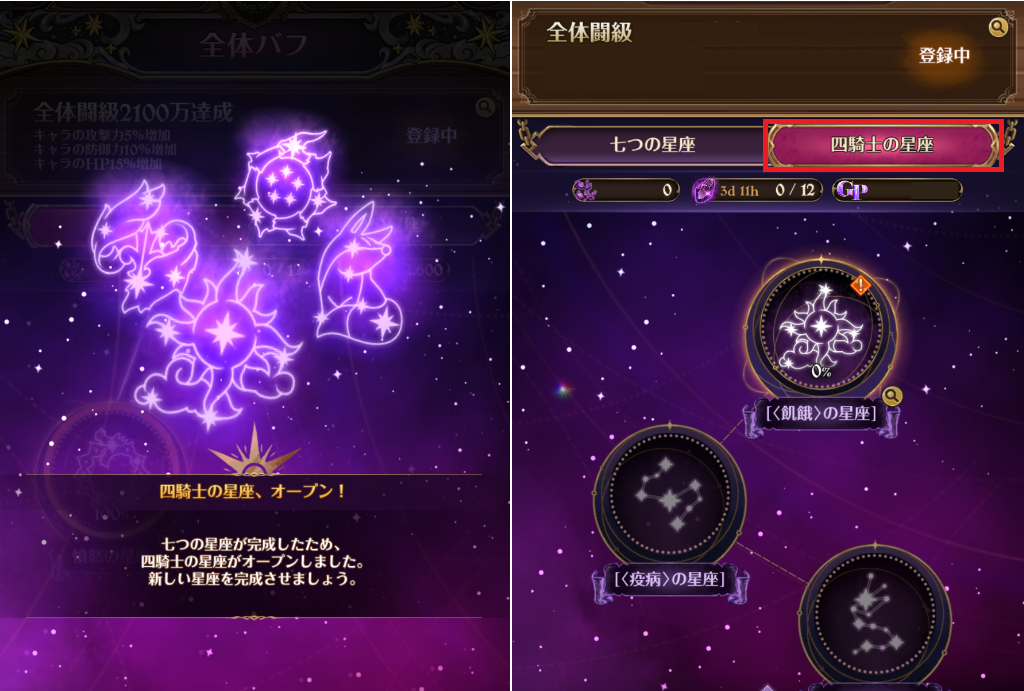 ・[全体バフ]内で確認できる育成システムである星座に[四騎士の星座]を追加します。