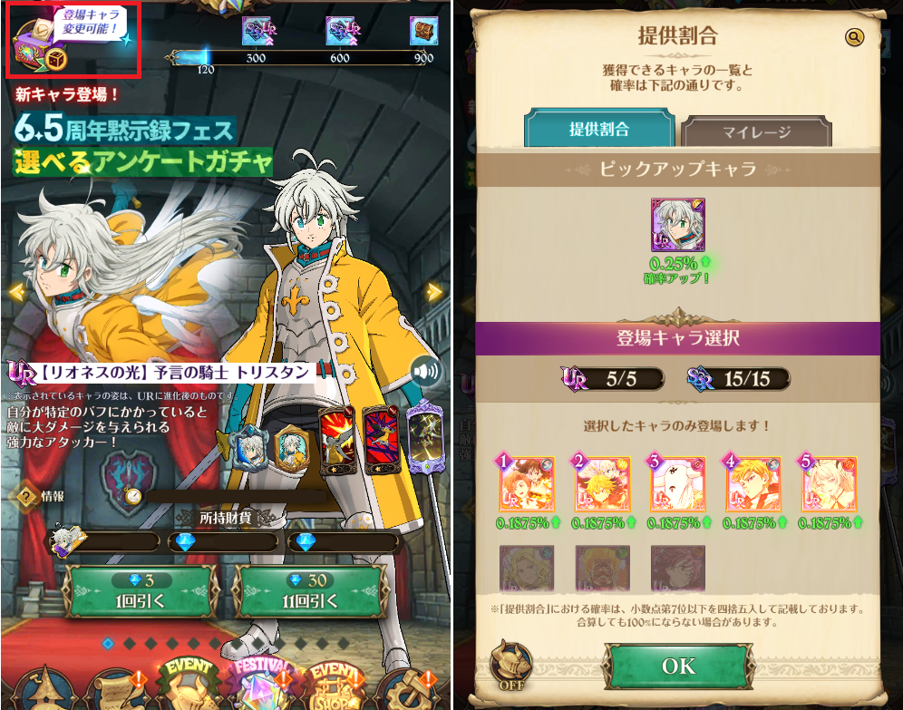 ※新キャラ[UR【リオネスの光】予言の騎士 トリスタン]は当ガチャ期間終了後、常設ガチャのラインナップに追加されません。