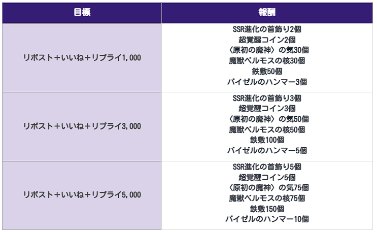 ※リポスト+いいね+リプライ5,000を突破したため2月19日(木)メンテナンスにて報酬[SSR進化の首飾り5個、
